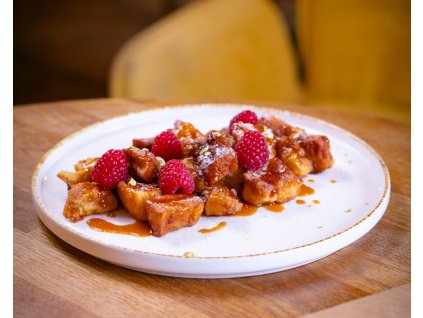 Vianočka obalená vo vajíčku so škoricovým cukrom, karamelom a malinami