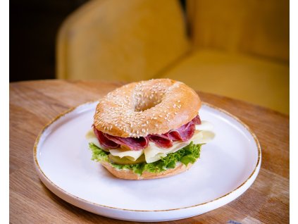 Sezamový bagel plnený salámou, plátkovým syrom, chrumkavou kyslou uhorkou a čerstvým šalátom. Dochutené majonézou a horčicou pre perfektnú rovnováhu chutí.