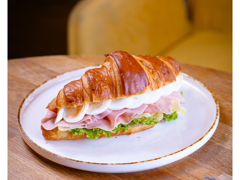 Maslový croissant plnený kvalitnou šunkou, vajíčkom natvrdo, syrom, uhorkou a čerstvým listovým šalátom. Pripravené ráno, ideálne na rýchle raňajky doma aj v kancelárii.